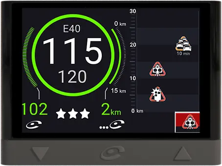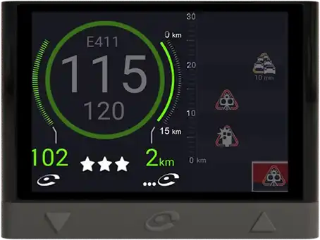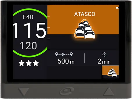 Alerta de incidencias en la carretera como accidentes, estrechamientos, tráfico, obras en la vía…, incluye más de 30 alertas diferentes. Además, muestra la velocidad máxima permitida y la velocidad a la que se circula, para ayudarte a respetar los límites. Es compatible también para motos